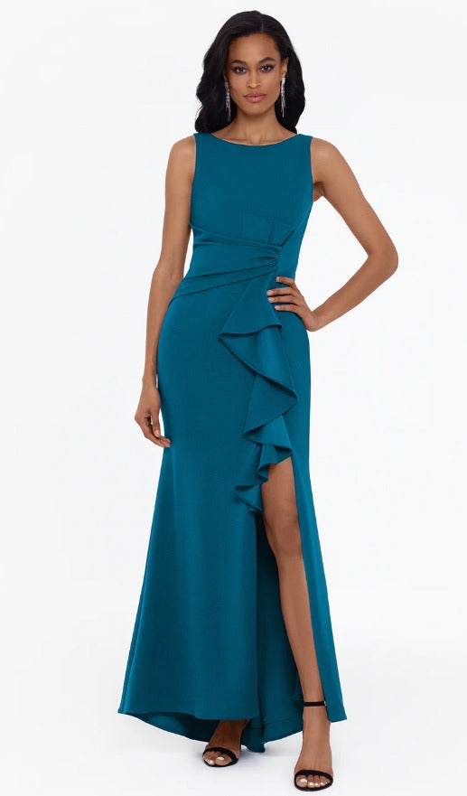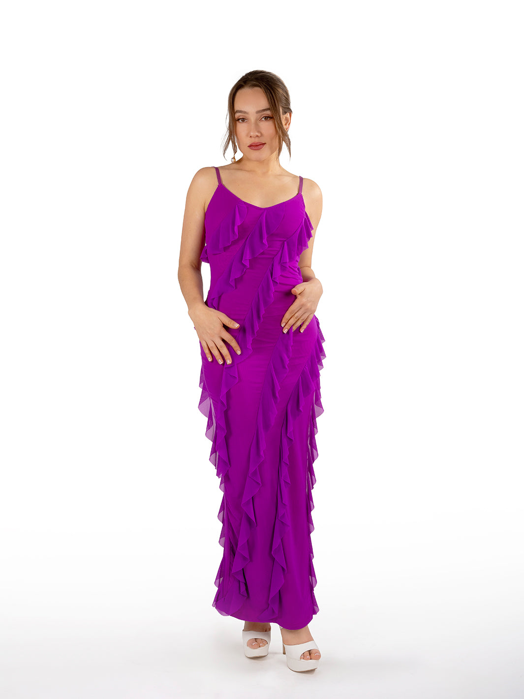 Vestido Morgana color púrpura largo ajustado con olanes y tirantes