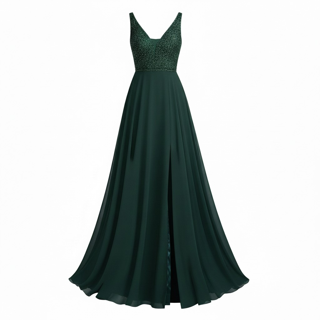La falda de tela ligera y fluida crea un movimiento encantador al caminar, y la abertura lateral añade un toque atrevido sin perder la clase. Perfecto para graduaciones, bodas, galas o cualquier ocasión donde quieras destacar con un look inolvidable.